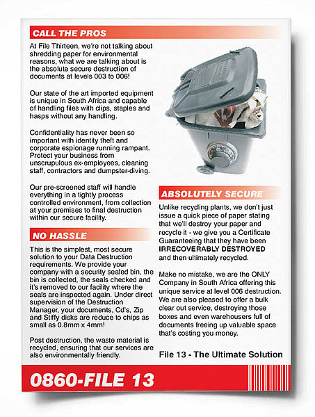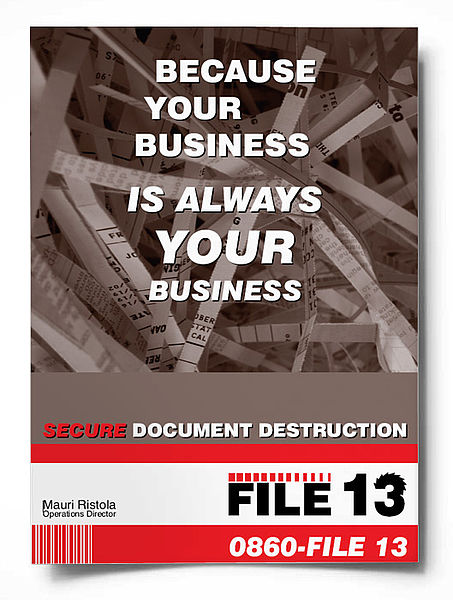 This project involved designing new brochures and a Corporate ID for File13. For this, we used Photoshop for photo manipulation and Illustrator to produce print-ready PDFs. Corel Draw was used for the inital layouts and spreads.