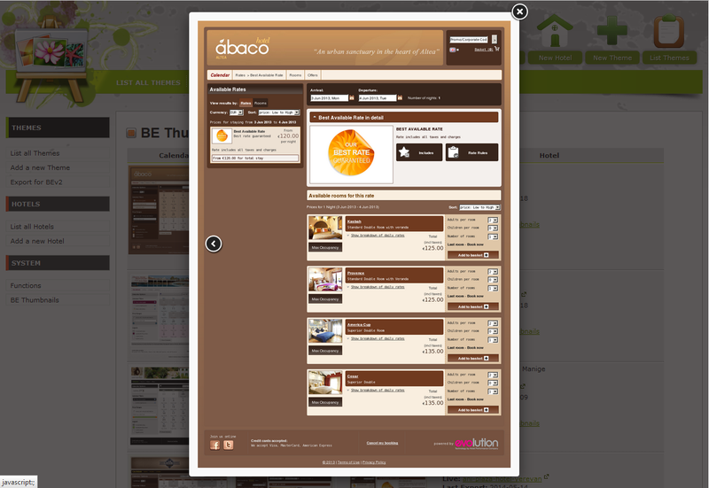 Both front- and backend was built entirely bespoke, using HTML, CSS, JavaScript, PHP, MySQL and jQuery UI. As jQuery Themeroller, at that time, did not offer exporting themes of previous versions, we have converted one of their themes into a templated css file which is then rendered by php to export a customised CSS file, but using the same version every time. Theme images were remotely fetched from the live Themeroller site, using curl, and packaged in the correct folder structure and then zipped server size. The theme could then be uploaded to a booking engine and unzipped on the server to install it.