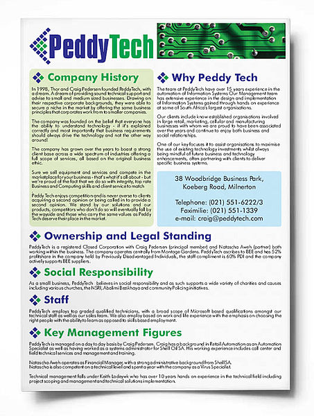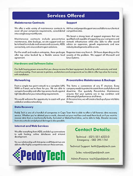 This project involved designing new brochures and a Corporate ID for PeddyTech. For this, we used Photoshop for photo manipulation and Illustrator to produce print-ready PDFs and CorelDraw for inital spreads.